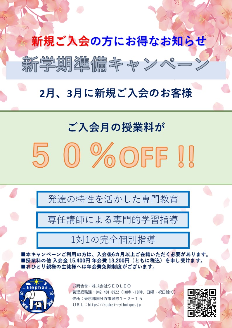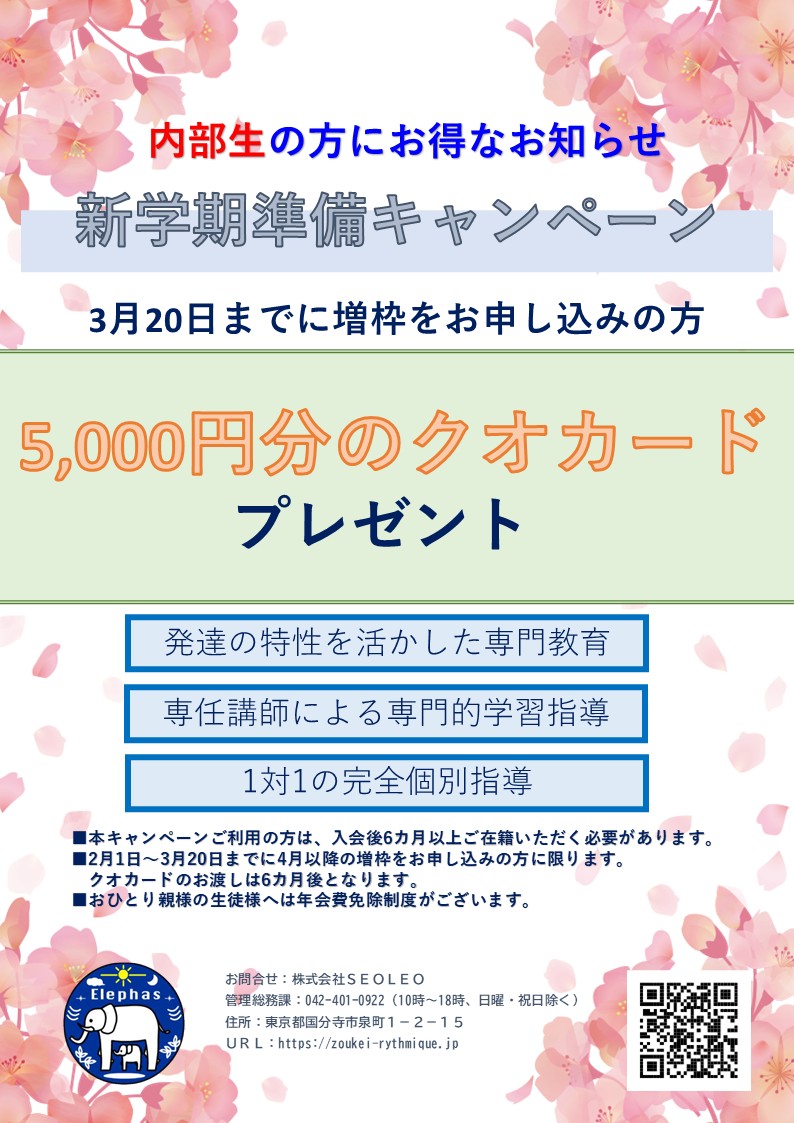 エレファースでは、3月20日までに増枠を申し込まれた内部生と新規ご入会の方にお得なキャンペーンを行います。