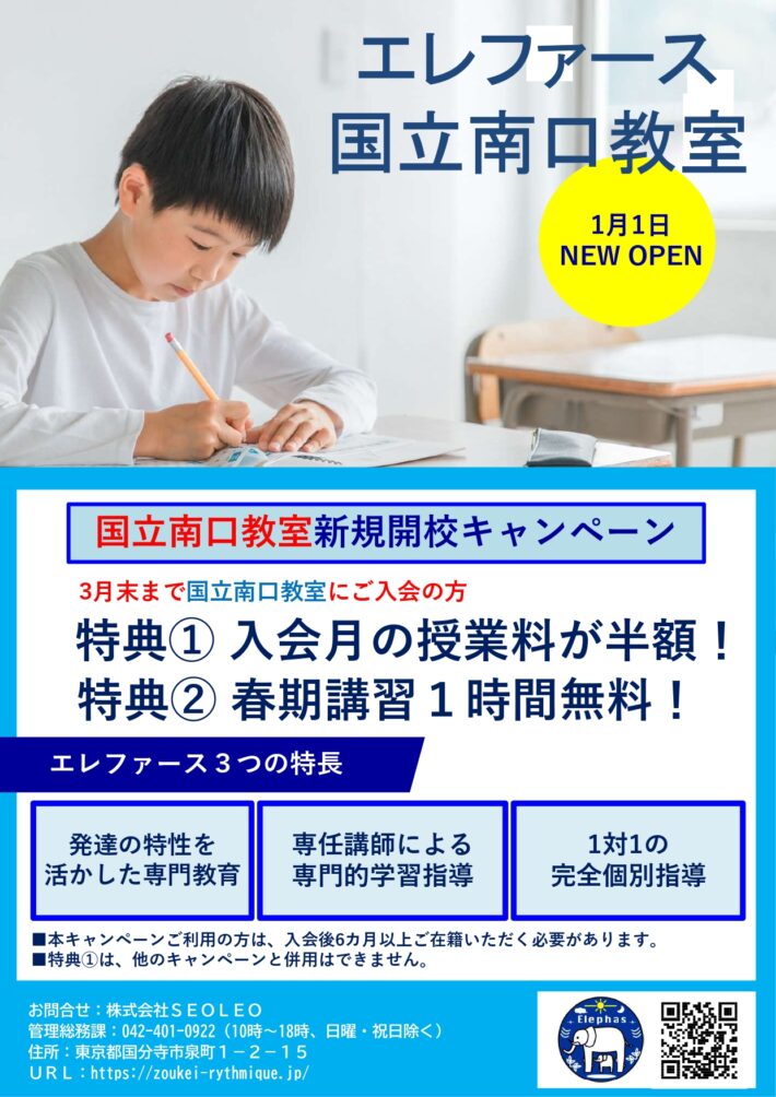 プレオープン致します12月15日より無料体験授業を受け付けておりますので、お気軽にお問い合わせください。発達支援教室エレファース国立南口教室は国立駅より徒歩9分です。